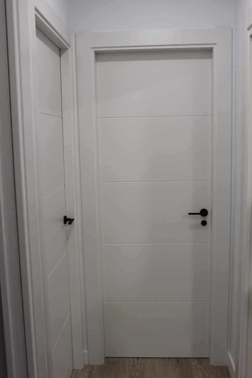 Instalación Terminada de puertas ciegas mod. 5-p lacado en blanco con herrajes en negro . Instalación llevada a cabo en Valladolid