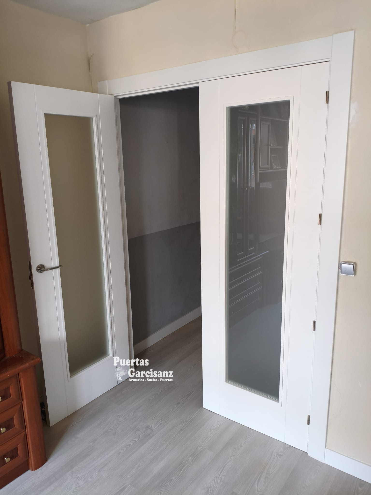 Puerta Vidriera hoja doble de un vidrio lacada en blanco instalada en Valladolid
